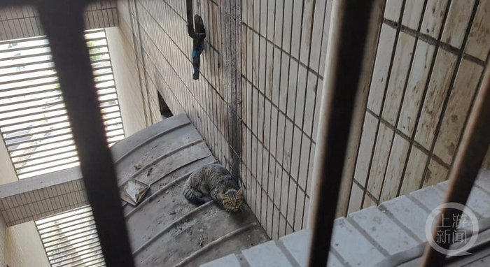 据报警人称,他们是19楼公司的职员,在星期一上班的时候,就已经有同事听见猫叫,但是并没有找到声音来源,今天才在18楼楼梯间发现,窗外雨棚上有一只狸花猫已经奄奄一息。
