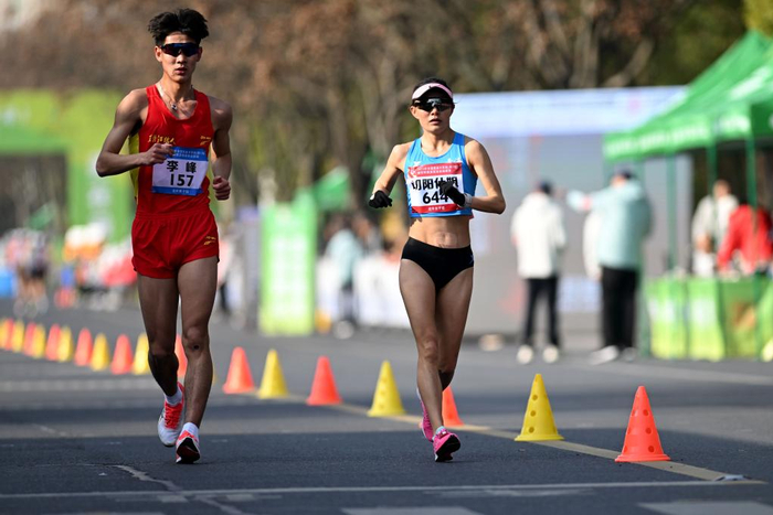 3月4日,切阳什姐(右)在2023年全国竞走大奖赛暨世锦赛及亚运会选拔赛女子35公里竞走比赛中。新华社记者黄博涵摄