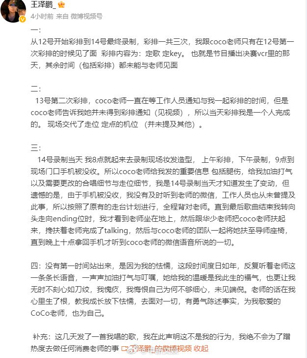 “没有第一时间站出来,是因为我的怯懦,这段时间度日如年,反复听着老师这一条条长语音,一声声加油打气与叮嘱,她给我的温暖是我此生的福气,也更让我无时不刻心如刀绞,我愧疚,我悔恨自己为何不够细心,未见端倪。老师的话在我心里生了根,教我成长放下怯懦,去面对一切,有勇气陈述事实,为我敬爱的CoCo老师,也为自己。”王泽鹏在微博中表示。