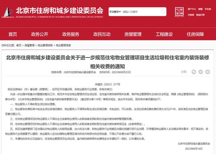 为进一步加强市级重点问题整改整治工作,规范本市住宅物业管理项目生活垃圾、住宅室内装饰装修相关收费,维护物业管理相关主体的合法权益,根据《物业管理条例》(国务院令第504号)《北京市物业管理条例》《住宅室内装饰装修管理办法》(建设部令第110号)等相关规定,结合本市实际,现将有关事项通知如下: