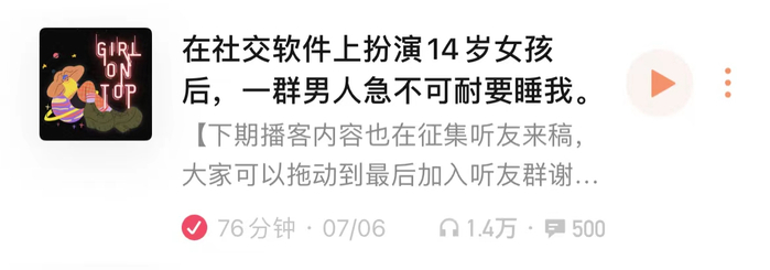 录制这期播客的时候,阮梦手心不断冒汗,再一次回到那种崩溃的情绪中,最终和周玥聊的内容也比较有限。在看到评论区的女孩子们分享被骚扰的经历后,阮梦体会到了被包容和被安慰。她觉得,分享这些事情是给自己一个出口,以后的人生一定会更好。