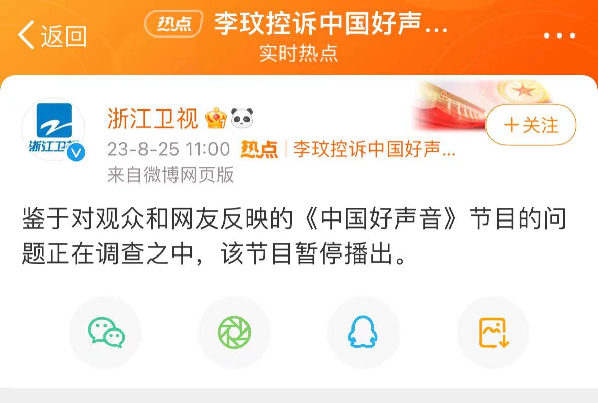 8月25日,浙江卫视微博发布最新消息称,鉴于对观众和网友反映的《中国好声音》节目的问题正在调查之中,该节目暂停播出。