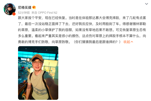 当晚,尼格买提发文向大家报平安,表示自己的伤情虽然看起来严重,其实只是很小的擦伤,目前也已经恢复。