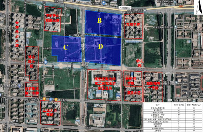 河北医科大学新校区用地被顺平大街、天宁路、罗家庄路与朱河街分成A~F共计6个地块。分为五个功能区,分别是公共教学区、学院教学区、生活区、运动区以及国际交流中心。