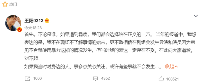 王阳写道:“首先,不论是谁,如果遇到霸凌,我们都会选择站在正义的一方。 当年的报道中,我想表达的是,我不在现场不了解事情的始末,更不敢相信在剧组会发生导演和演员因为意见不合就使用暴力这样的情况发生。但当时我的表达一定存在不妥,在此向大家道歉,对不起!如果我当时对身边的人、事多点关心关注,或许有些事就不会发生…”