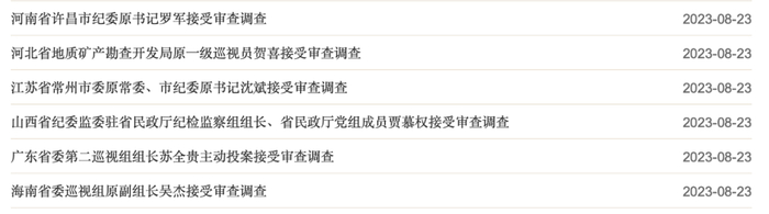 8月23日,6名内鬼落马:河南许昌市纪委原书记罗军、江苏常州市纪委原书记沈斌、海南省委巡视组原副组长吴杰、广东省委第二巡视组组长苏全贵、河北省地质矿产勘查开发局原一级巡视员贺喜、山西省纪委监委驻省民政厅纪检监察组组长贾慕权。