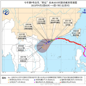 预计9月3日夜间至4日白天,台湾以东洋面将出现6到9米的狂浪到狂涛区,东海南部、钓鱼岛附近海域、台湾海峡、南海东北部将出现4到6米的巨浪到狂浪区,近海海域海浪预警级别为橙色;福建近岸海域将出现3到4.4米的大浪到巨浪,该近岸海域海浪预警级别为黄色;浙江南部近岸海域将出现2到3米的中浪到大浪,该近岸海域海浪预警级别为蓝色。