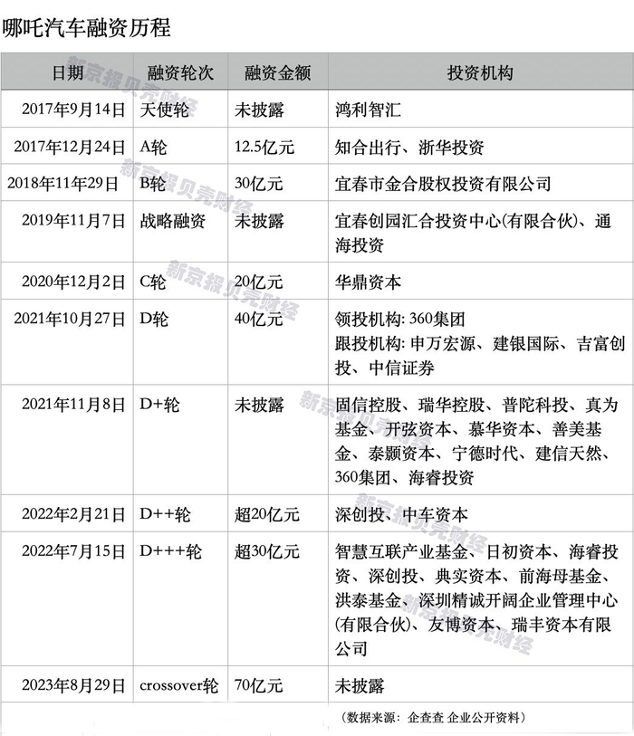 贝壳财经记者梳理发现,2017年至今,哪吒汽车已累计完成10轮融资,总额达222.5亿元(不含未披露融资金额)。至于融资的投资方,也颇为豪华,包括宁德时代、360集团、瑞华控股、华鼎资本和深创投等。