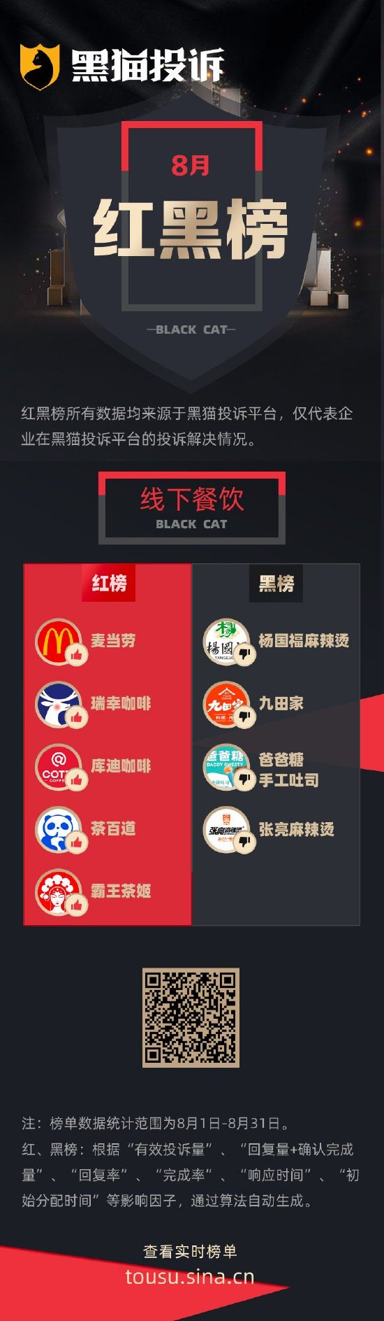 8月黑猫投诉线下餐饮领域红黑榜:杨国福麻辣烫吃出虫子腹泻高烧