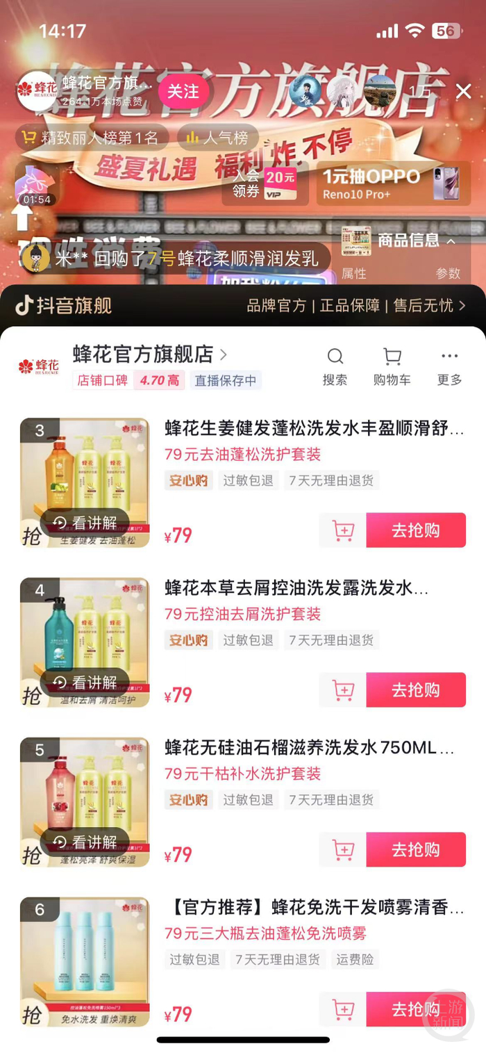 12日中午,上游新闻查询蜂花抖音直播间旗舰店发现,这三款洗护套装券后价格均为75元,目前三款销量累计已过万。