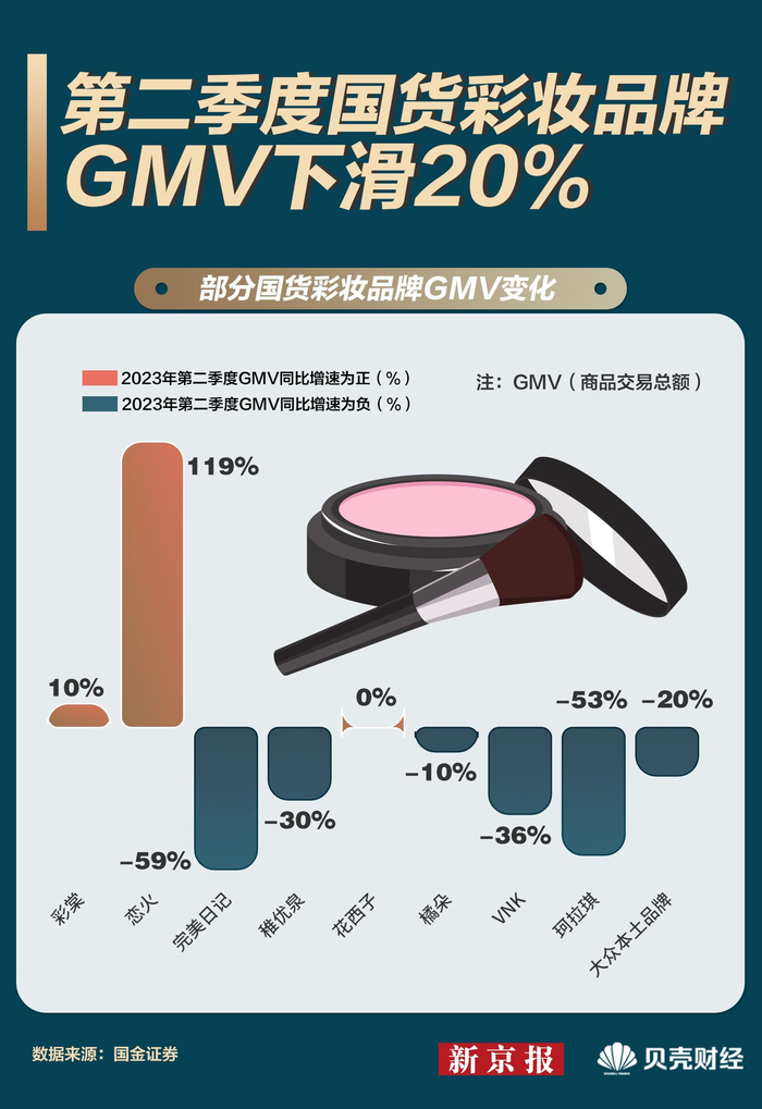 2023年中国化妆品市场规模预计可突破5100亿元,其中,国货美妆品牌的规模不断攀升,目前中国化妆品市场国货市占率接近50%。艾媒咨询发布的《2023年中国国潮美妆消费趋势洞察报告》显示,有71.22%的受访消费者表示较多使用国货美妆品牌。但今年第二季度国货彩妆品牌GMV(商品交易总额)增长承压,据国金证券统计,第二季度天猫大众本土彩妆品牌GMV同比下滑20%,统计范围内的8家企业中,仅彩棠、恋火保持增长。