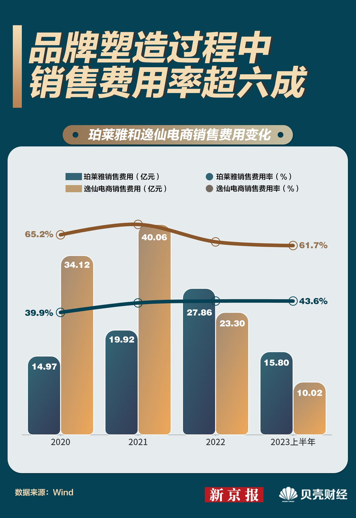 2020年至2023年,彩棠所属的珀莱雅销售费用持续增长,今年上半年销售费用同比增长41.5%,销售费用率基本与2022年持平。完美日记母公司逸仙电商的销售费用率有所下滑,值得注意的是,逸仙电商二季度因为关闭业绩不佳的线下门店以及销售人员薪酬开支减少,销售费用占总净收入的百分比下降,但部分被在线广告费用的增加所抵消。