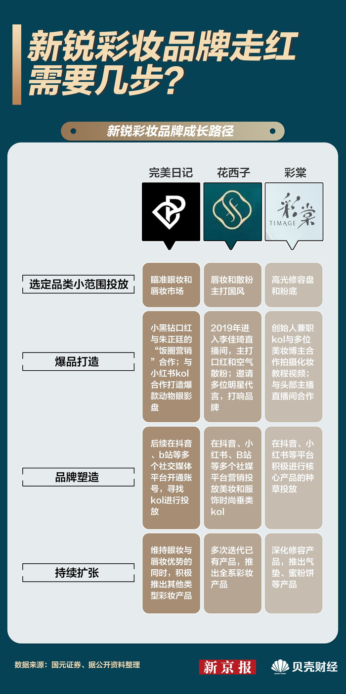 国产彩妆品牌更爱用细分领域单品,依托电商和社交品牌积攒原始品牌声量。据国元证券分析,传统美妆品牌多为国际品牌,品牌成立时间长,多聚焦口红、粉底等规模大、高需求的品类。而国货“新秀们”多会选择更细分的赛道。此外,通过社交平台KOL互动,实现小范围“出圈”,比如利用小红书KOL合作打造爆款动物眼影盘;彩棠创始人彩妆师唐毅与多位美妆博主拍摄化妆教程视频,为品牌带来关注度;花西子则较早进入直播领域,与头部主播深度绑定并走红。