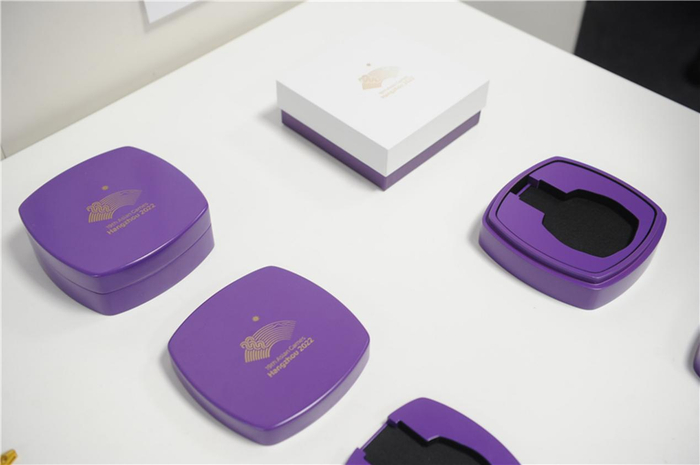 设计团队还为每块奖牌配备了专属奖盒。盒的形状和奖牌完美契合,内设两层,首层置奖牌,底层叠放绶带,以杭州第19届亚运会会徽“潮涌”同款“虹韵紫”呈现,使永久保存的奖牌带着良渚源远流长的气质,向世人展示中华文明的独特神韵。