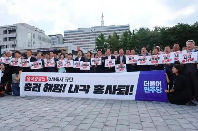 在检方提请逮捕李在明后,共同民主党也迅速回击,即时向国会提交了国务总理韩德洙的弹劾动议案。9月18日中午,多名共同民主党议员还前往总统府抗议检方对李在明进行“不正当调查”,呼吁内阁总辞。