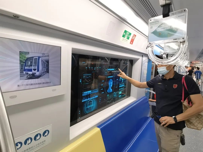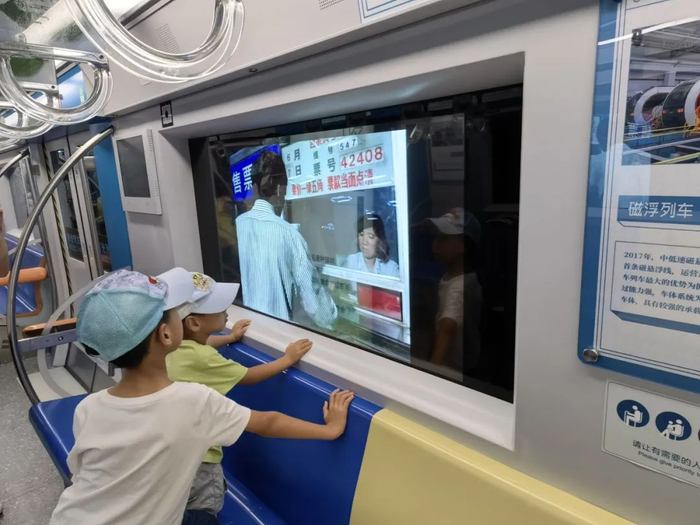 时光列车上布置了不同年代主题的车厢。走进另一节车厢,这里一副上世纪90年代的模样。座椅已经变成了竖排,空间更宽敞,主色调也从绿、棕、黄变成了更为熟悉的红白撞色。而时光列车的中间两节车厢就是迈入21世纪后的地铁车厢新样式,车厢玻璃也变成了屏幕,播放着北京地铁发展的宣传片。