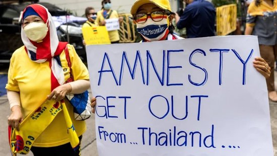 2021年11月25日,在曼谷举行的示威活动中,一名王室支持者举着标语,呼吁人权组织国际特赦组织停止在泰国的运营。(图源:英国卫报)