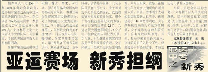 2002年,出征釜山亚运会的686名中国运动员中,参加过亚运会和奥运会的只有201人,完全称得上是一支以新人为主的队伍。(2002年9月29日《北京日报》10版,《亚运赛场 新秀担纲》)2006年,参加多哈亚运会的647名中国运动员中,有413人从未参加过国际综合性大赛,占运动员总数的63.8%。时任中国代表团副团长、国家体育总局副局长段世杰说:“此番出征不仅要保留好的传统,还要注意锻炼新人,要为2008年奥运会练兵。”(2006年11月18日《北京日报》8版,《中国亚运团刘翔郭晶晶领衔》)