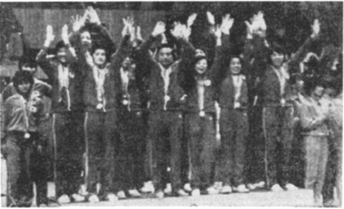 1982年,在新德里举行的第九届亚运会上,我国金牌总数首次夺魁。图为中国女子篮球队夺冠后在领奖台上向观众挥手致意。 刘心宁摄