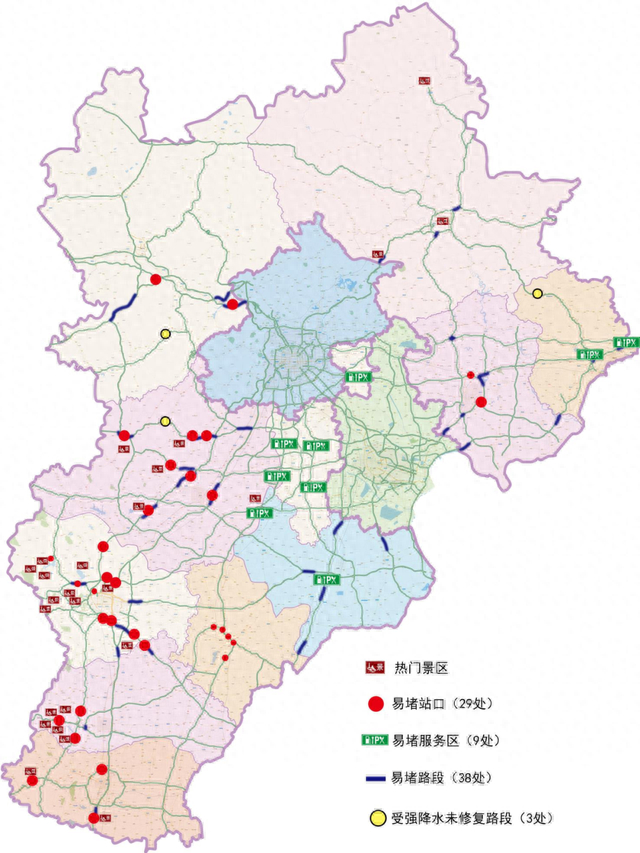 预判易堵路段38处,易堵站口29处,易堵服务区9处,受强降水未修复路段3处。