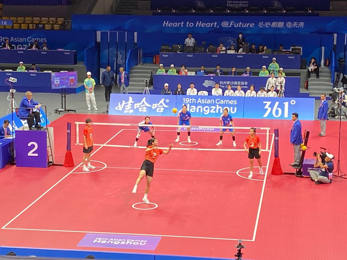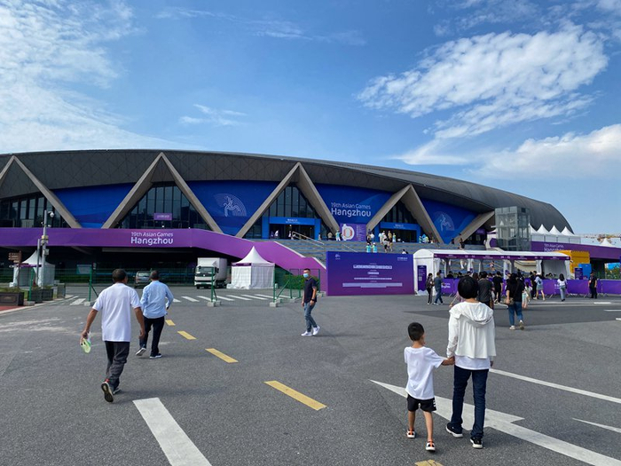 藤球项目的全部比赛均由金华体育中心体育馆承办,从9月27日一直激战到10月7日亚运最后一天。“脚踢的排球”藤球发源于东南亚,已有6个世纪的历史,现代藤球则发展了半个多世纪。1990年北京亚运会,藤球成为正式比赛项目。在中国,藤球非常小众,以至于有人误以为它是本届亚运会才成为赛事项目的,这也体现了亚运会展示亚洲多元文化的价值。