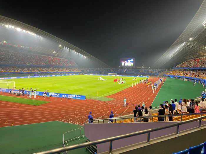 藤球比赛结束时,男足比赛也在体育场鸣哨开球了。从体育馆到体育场可以走快捷通道到检票口,不用再次安检。16时的中国台北与吉尔吉斯斯坦的比赛和19时30分的韩国与巴林的比赛,采用通票制,允许二次入场,观众看完第一场比赛之后可以离场,到晚上再回来接着看。体育场下午时分阳光明媚,3万个座位目测上座率超过5成。