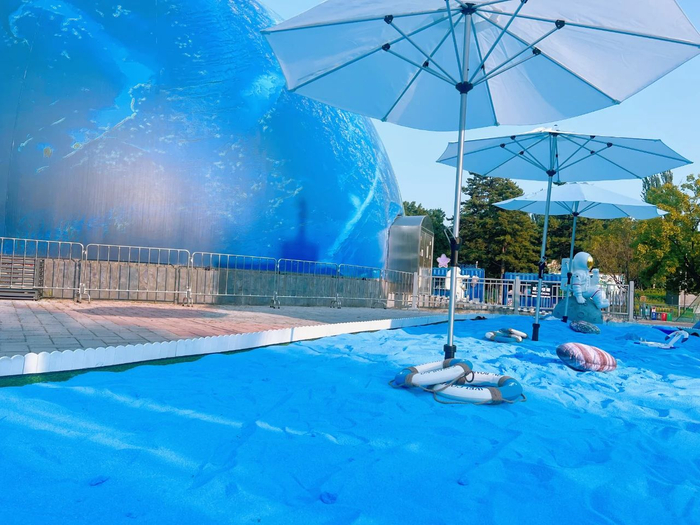 直径26米的地球、直径15米的火星、直径3米的月球……随着夜幕降临,只见球幕外膜灯光亮起,清晰的地球、火星和月球的地貌显现,由多个球幕以及星空舱组成星空基地点亮北京园博园。
