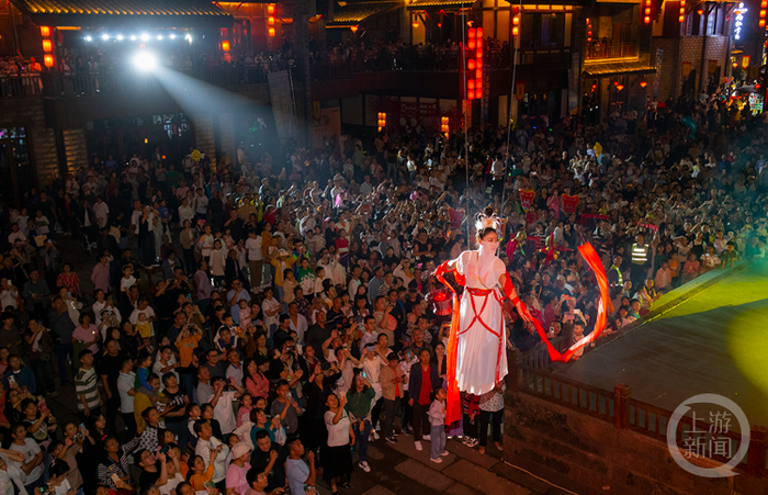9月29日中秋节之夜,万州区天生城文旅街区,“嫦娥奔月”“京剧脸谱”等民俗文化互动活动精彩纷呈,节日氛围浓郁,吸引各地游客到此游玩度假。