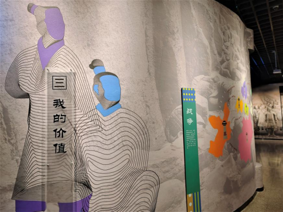 张宁:第一个词是“有趣的”。我希望我做的这个展览是有趣的,打破以往只能观看文物的情况,观众在这个展览里能够互动、听声音、看视频,能够在心里有所触动。比如展览的整个的色调虽然是以秦俑的这种灰色为主,但是我添加了大量蓝色的、紫色等的饱和度非常高色块,这些也是来自于兵马俑身上的不同的颜色,希望观众能够感受到一些色彩的冲击力。然后下来就是“接地气的”,我希望我这个展览是观众可以看得懂的,所以文字上用了大白话的叙述方式,“我是谁?我来看看 6155 是谁,他有什么样的经历,他的好兄弟是谁,他们拿什么样的武器,他们干什么样的事情”。最后,我希望这个展览是“有情感的、有温度的”,能够去体现一个微小的颗粒在历史的洪流中它存在过,它是 6155,它有什么样的价值?其实这个展览也是希望去观众能够了解到我们也只是一个微小的颗粒,也不可能或者很难在历史上留下我们的名字,但是我们也要做一件一件的让自己振奋或者有意义的事情。