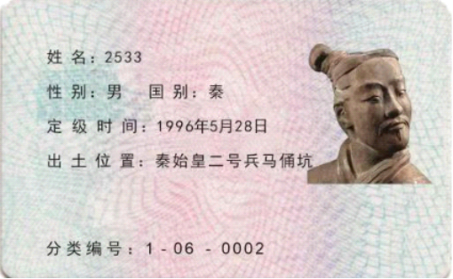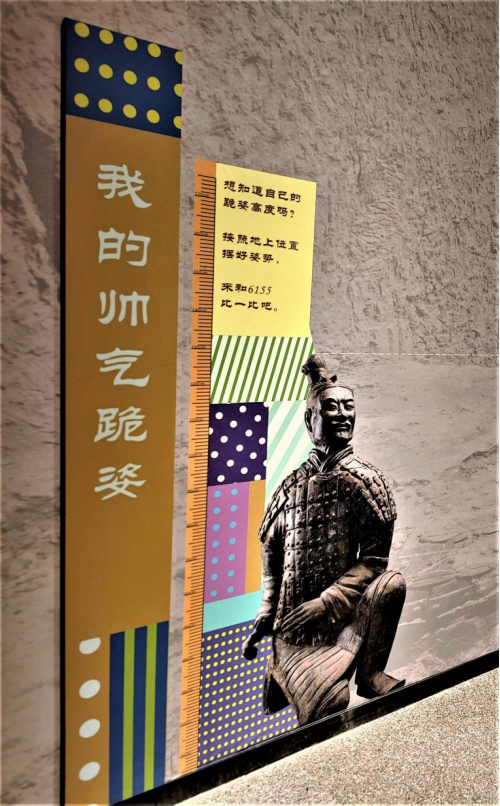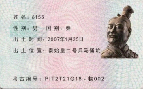 张宁:“我是谁”部分首先介绍了 6155 这件跪射俑的一些信息。从开篇的时候我们就做了一个有趣的尝试,给这个跪射俑做了一个身份证,帮助拉近他与观众的距离。所以很多观众进来说“哎哟,他有身份证”,然后他会仔细看一下身份证上的一些信息。我们从开始就想给观众一个想法,就是他不是一个陶俑,他是一个人,然后再去给观众介绍跪射俑的一些细节,比如他的脸是国字脸,八字胡,他穿齐膝长襦,外穿披膊铠甲,下着短裤,他的鞋子是42码齐头翘尖履。看的过程中很多观众就会对比自己和跪射俑的身材数据,形成人与人之间的对比关系。