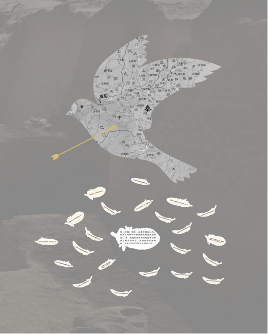 秦国当时因为作为胜利方,所以相对来说杀敌数量有记载的是 184 万,但是在那个时代秦人到底又伤亡了多少?其实史记里对秦代伤亡数字记载的寥寥无几,但是我们可以想到在那个时代,任何一场战争就是杀敌一千自损八百,很多士兵上了战场是回不来的。所以我们用了一个中箭、折翼的鸽子,表达那个时代无数在战场上牺牲的士兵,每一个折翼掉落的羽毛上都记录了史记中曾经打过的实实在在的战争和伤亡数字。