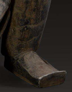 跪射俑穿 42 码齐头翘尖履,鞋带穿过 3 个襻扣,系成花节于脚面,鞋底是千层底,有着防滑、耐磨的特点,细密的针脚被工匠精细地刻画出来,后跟和脚掌的针脚密,可以增强对湿滑地面的附着力,脚心的针脚稀疏,穿起来更加舒适。