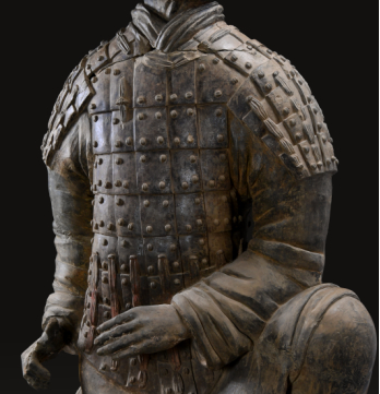 跪射俑身穿齐膝长襦,外穿披膊铠甲,下着短裤盖住膝盖,再穿护腿,胸甲是上片压下片,腹甲和臂甲都是下片压上片,这样的叠压方式和人体的运动方向一致,无论弯腰扩胸或抬臂,都十分灵活。