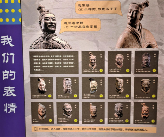 因为每一个陶俑的表情都不太一样,所以我们又做了秦俑语言表达的部分。我们根据他的表情去想象一段文字。比如说有一个陶俑眼睛瞪得特别大,用我们现在网络语言说“你瞅啥,瞅你咋地”。我们把这个话做成了陕西方言版的语音,用手机 NFC 扫描就可以播放,通过这种方式让陶俑说话,然后游客边听秦音,边看陶俑的表情。