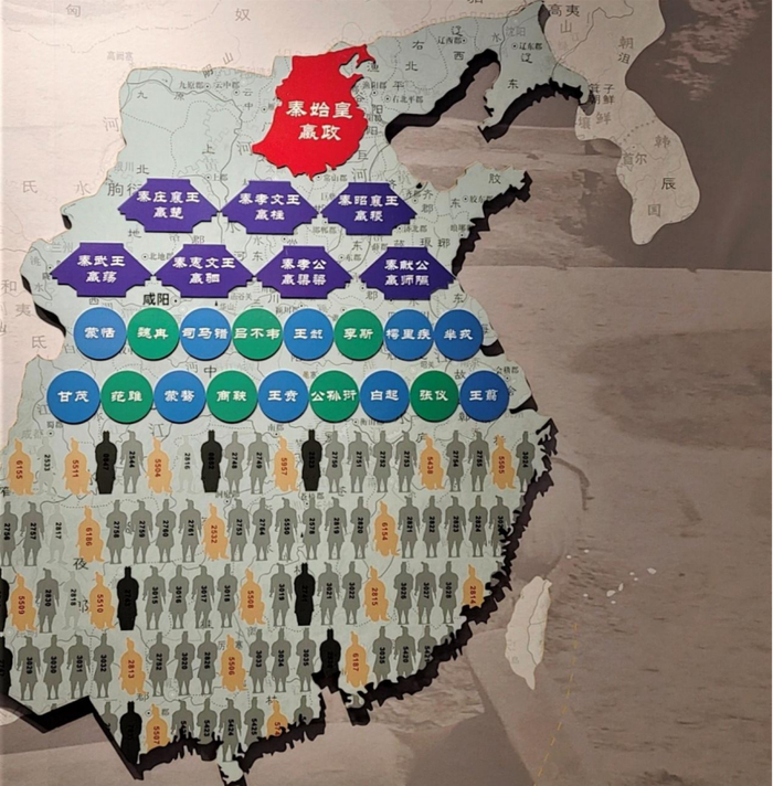 这个地方做了一个中国的地图和秦国的版图,秦国的版图最上面是秦始皇,下来部分是秦国的历代先君。再下面是历史上有记载的文臣、武将比如张仪、王翦、商鞅等等。最下面是大量的用文物编号代替的人形的、陶俑的形象,其实这些人才是秦始皇的想法、文臣武将的战略战术真正意义上的执行者,因为他们的勇往无前,流血牺牲,才会有秦国这样的版图,这就是每一个小小士兵的意义和价值。