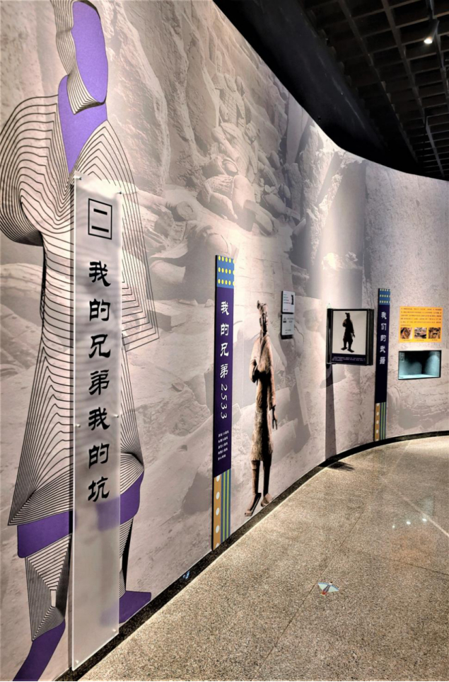 张宁:这个展览其实贯穿的就是小和大的关系,小人物和大人物,小人物就是 6155,名字都没有,大人物就是秦始皇,还有微观与群像的关系,小人物就是只是一个普普通通连名字都没下没留下的特别微小的一个人,但是那个群像就是秦军整体带来的力量感。这个展览也是想表达这些想法,让观众能够在前面去了解两个陶俑的整个内容信息和他们的经历,他们的细节,他们的武器,整个的知识背景,在最后一个部分能够去了解那个时代微小人物的一些价值和他们的想法。