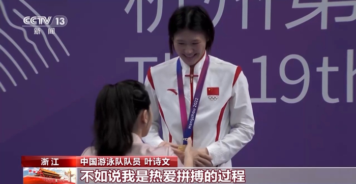 在杭州亚运会游泳女子200米蛙泳决赛中,杭州姑娘叶诗文,在家门口赢得了金牌。年少成名,经历过运动生涯的最低谷,时隔九年,重返亚运赛场,叶诗文一直在用坚持诠释热爱,向着下一个巅峰冲刺。