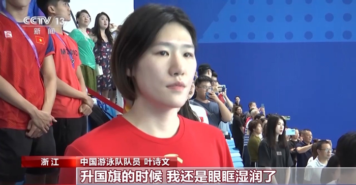 中国游泳队队员 叶诗文:升国旗的时候,我还是眼眶湿润了。(国旗升起)那一刻,自己觉得特别自豪,觉得所有的努力都没有白费。