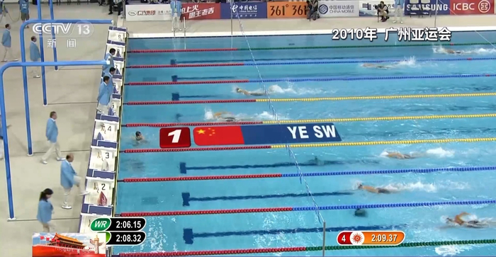 在杭州亚运会女子200米蛙泳的决赛现场,中国选手叶诗文在150米后,已经领先其他选手。冲刺,2分23秒84,看到比赛成绩时,叶诗文在泳池里,用力地拍打着水花。