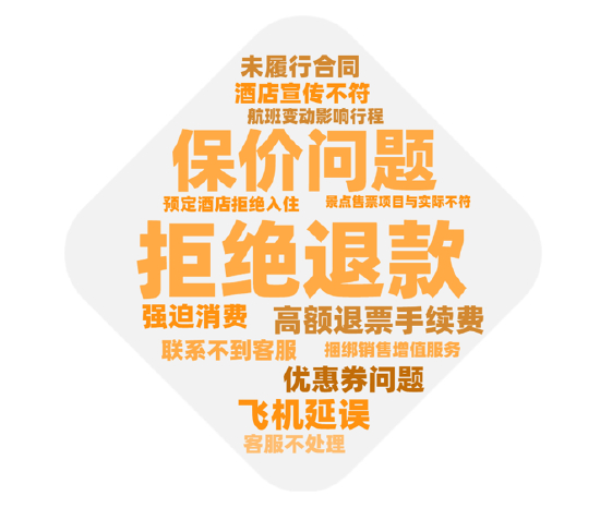 今年双节期间,旅游出行住宿行业主要投诉集中于退款相关问题,拒绝退款、高额退票手续费等问题较多,除此之外保价、酒店宣传不符、预定酒店拒绝入住、飞机延误、捆绑销售增值服务等问题也较多。