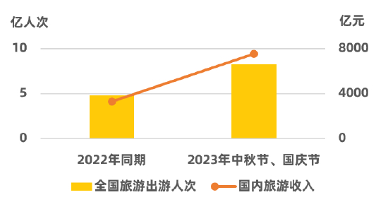 经文化和旅游部数据中心测算,2023年中秋国庆假期,全国国内旅游出游人数8.26亿人次,按可比口径同比增长71.3%,按可比口径较2019年增长4.1%;实现国内旅游收入7534.3亿元,按可比口径同比增长129.5%,按可比口径较2019年增长1.5%。全国假日市场平稳有序,文化和旅游行业复苏势头强劲。
