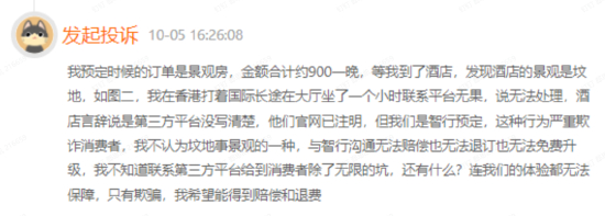 有用户投诉称从平台预定的酒店景观房到达酒店发现窗外就是坟地,景观房变“坟景房”。联系平台处理未果。酒店称自己官网有说明房间情况,认为是第三方平台责任。而平台客服称无法赔偿无法退订,也无法免费升级,两方来回踢皮球不予处理。