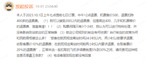 有用户投诉春秋航空称,购票至退票间隔仅几个小时,500元的机票被收取400多的手续费,手续费比例超80%。
