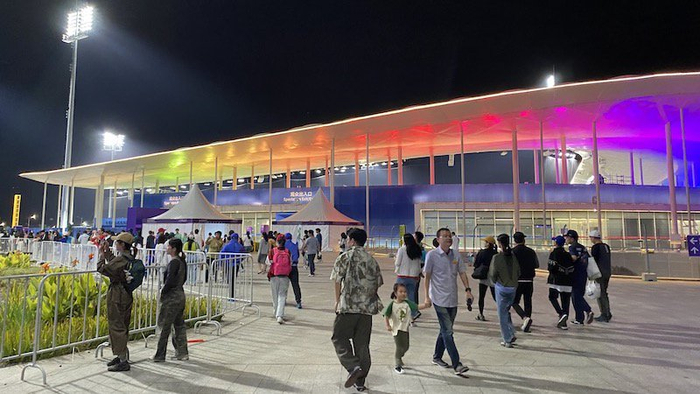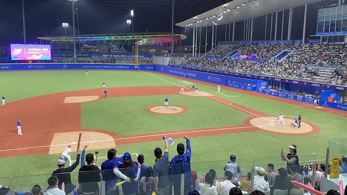 10月5日晚,记者入场时看到,两块场地均有比赛,二层步行通道从两块场地之间穿过,志愿者们在中央平台上迎接观众,支持中国台北棒球队的球迷们则在集合拍照留念。球场整体接近圆形,是半开放式的,灯光明亮。扇形的看台坐席区有网隔离,防止快速飞来的球伤及观众。靠外侧的看台也有较好的视野,能看清内场的较量。