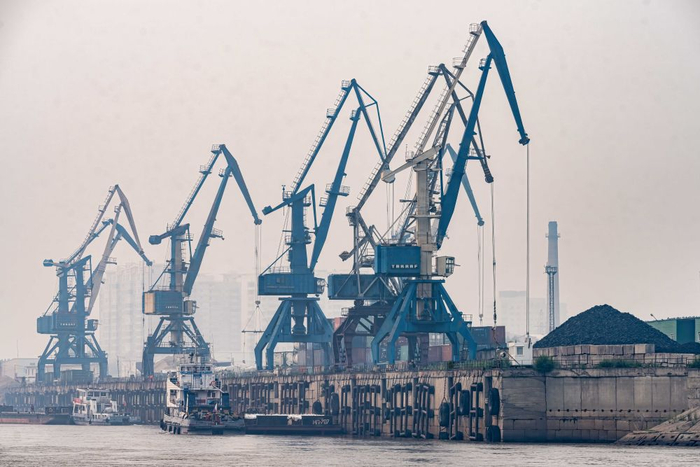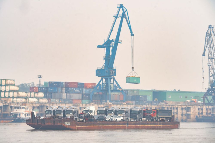 运送中国汽车的驳船抵达布拉戈维申斯克港。单一水路运输,受季节影响严重,出口的机械要多次倒运换装。