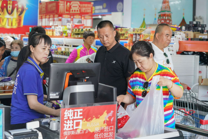人们在黑河市俄品多超市购物。超市货架上的巧克力、面包、红酒等产品充满了浓郁的“异国风情”。