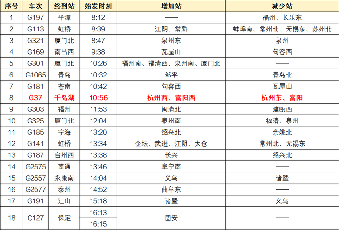 本次调图后,北京南站始发高铁列车中涉及18列次增加或减少停靠站,其中北京南站前往杭州方向列车首次经停杭州西站。