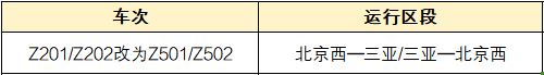 北京西——三亚Z201/Z202次改为Z501/Z502次。