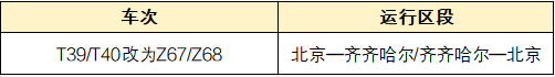 齐齐哈尔——北京T40次改为直达特快,车次改为Z68次;北京——齐齐哈尔T39次改为直达特快,车次改为Z67次。