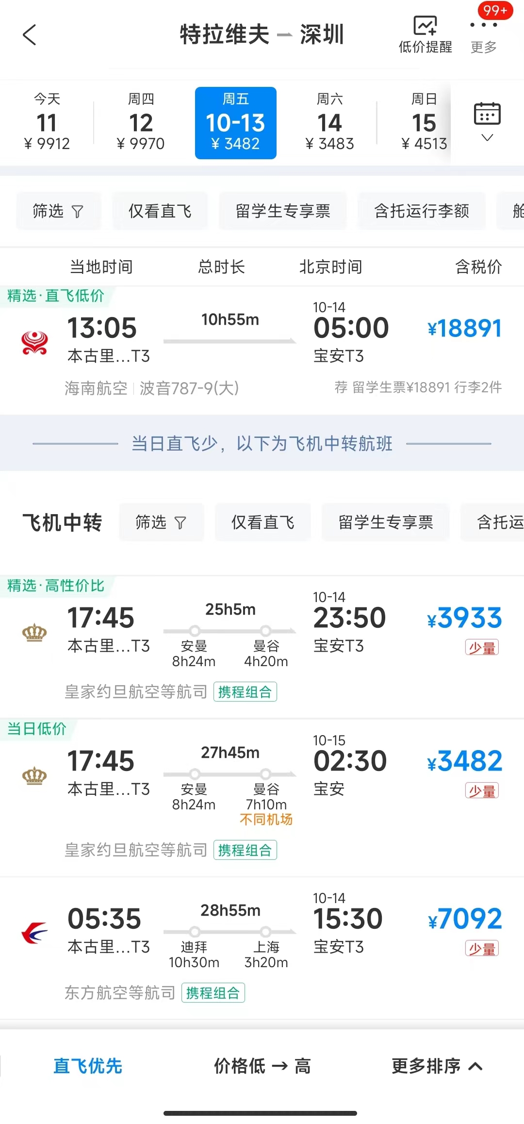记者查询相关订票平台发现,目前除了直飞回国,还有一些通过阿联酋,约旦安曼,泰国曼谷等中转回国的航班可选,不过,不少欧美航司已经暂时取消了直飞特拉维夫的航班。